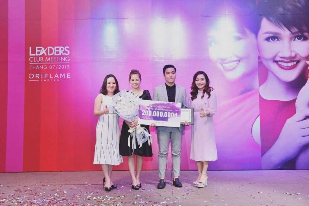 Tổng giám đốc Oriflame Việt Nam (áo trắng bên trái) trao tặng giải thưởng trị giá 200 triệu đồng đến vợ chồng anh