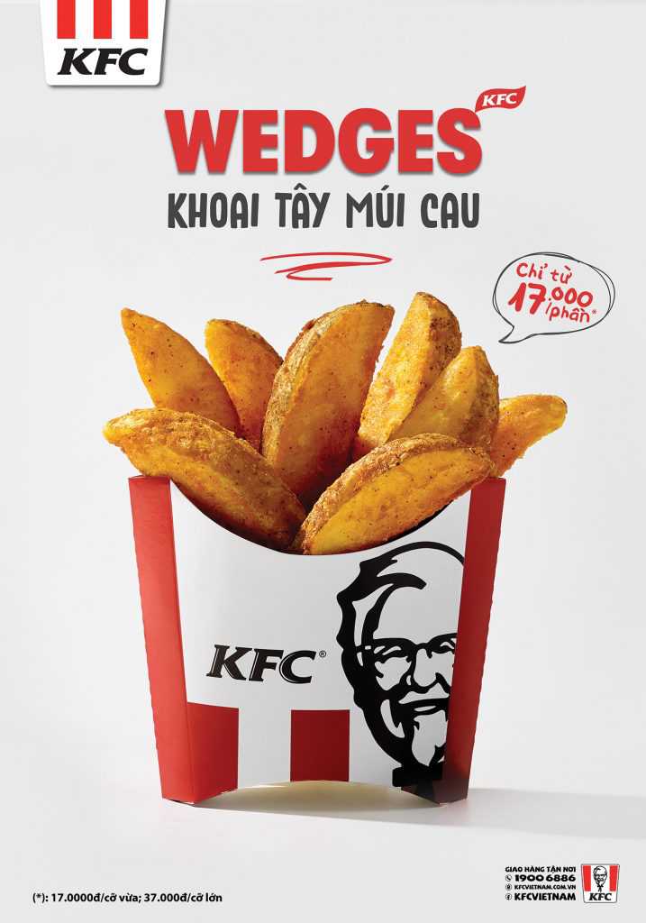 Tháng này, KFC sẽ giới thiệu đến bạn một sản phẩm mới toanh đến từ phương Tây có tên gọi “Wedges”, hay còn được gọi là Khoai Tây Múi Cau. Ghé ngay nhà hàng KFC để dùng thử món này bạn nhé! Wedges, Khoai Tây Múi Cau, được cắt thành từng miếng to hình múi
