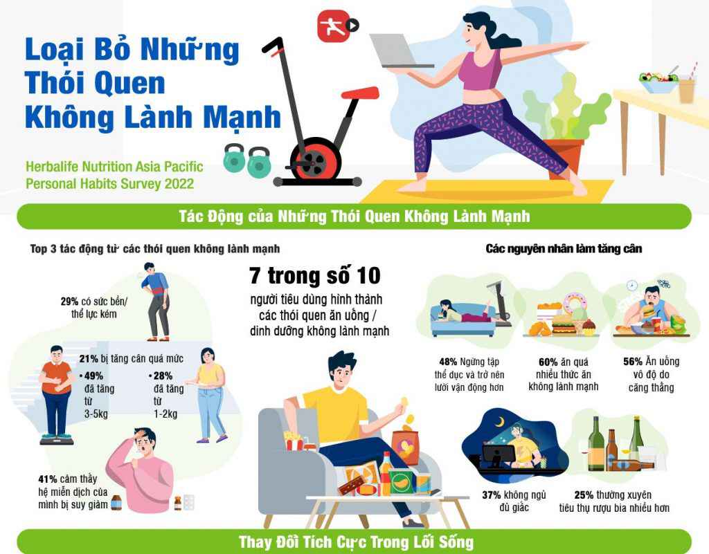Công ty dinh dưỡng hàng đầu toàn cầu, Herbalife Nutrition, đã công bố kết quả từ cuộc Khảo sát Thói quen Cá nhân Khu vực Châu Á – Thái Bình Dương. Theo đó, 9 trong số 10 người tiêu dùng tại Việt Nam muốn loại bỏ các thói quen sống thiếu lành mạnh của bản