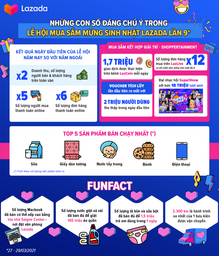 Lazada Việt Nam vừa khép lại Lễ hội mua sắm mừng sinh nhật lần thứ 9 diễn ra từ 27 – 29/3 với nhiều thành công rực rỡ. Doanh thu bán hàng của Lễ hội mua sắm lần này đã vượt gấp đôi doanh thu của Lễ hội năm ngoái chỉ trong ngày đầu tiên