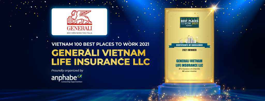 Với nhiều sáng kiến về chiến lược nhân sự đạt kết quả tốt, ngày 23/12/2021, Generali Việt Nam đã được vinh danh “Top 100 Nơi làm việc tốt nhất Việt Nam 2021” từ khảo sát của Anphabe. Anphabe là công ty tư vấn tiên phong về giải pháp Thương hiệu Nhà tuyển dụng và Môi trường làm việc Hạnh phúc.